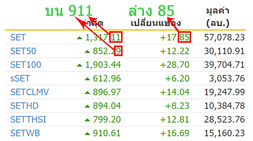 ให้เข้าไปที่ เว็บหุ้น ดูที่หุ้น SET และ SET50 หลังจากนั้นให้ตรวจสอบรางวัลได้ตามภาพ